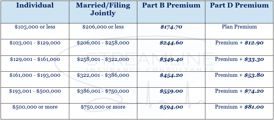 Lastly, are the Medicare Part D premiums which are also used to fund Medicare. These funds are influenced by IRMAA or Income Related Monthly Adjustment Amounts. IRMAA is used to determine your Medicare Part A and Part D premiums. The higher your income, the higher the premium you will pay. Currently the lowest Medicare Part B premium for 2024 is $174.70, which is available for those who file jointly & make less than $206,000 a year OR those filing as single and make less than $103,000 a year. Anyone with higher income (Even by 1 penny) will pay a higher Medicare premium.